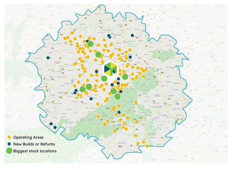 Below shows the location of existing centres of Fairhive stock (Operating Areas), larger concentrations of existing stock, and key new build locations. The map does not show all Fairhive stock or new build schemes, just larger concentrations and key expansion areas.
